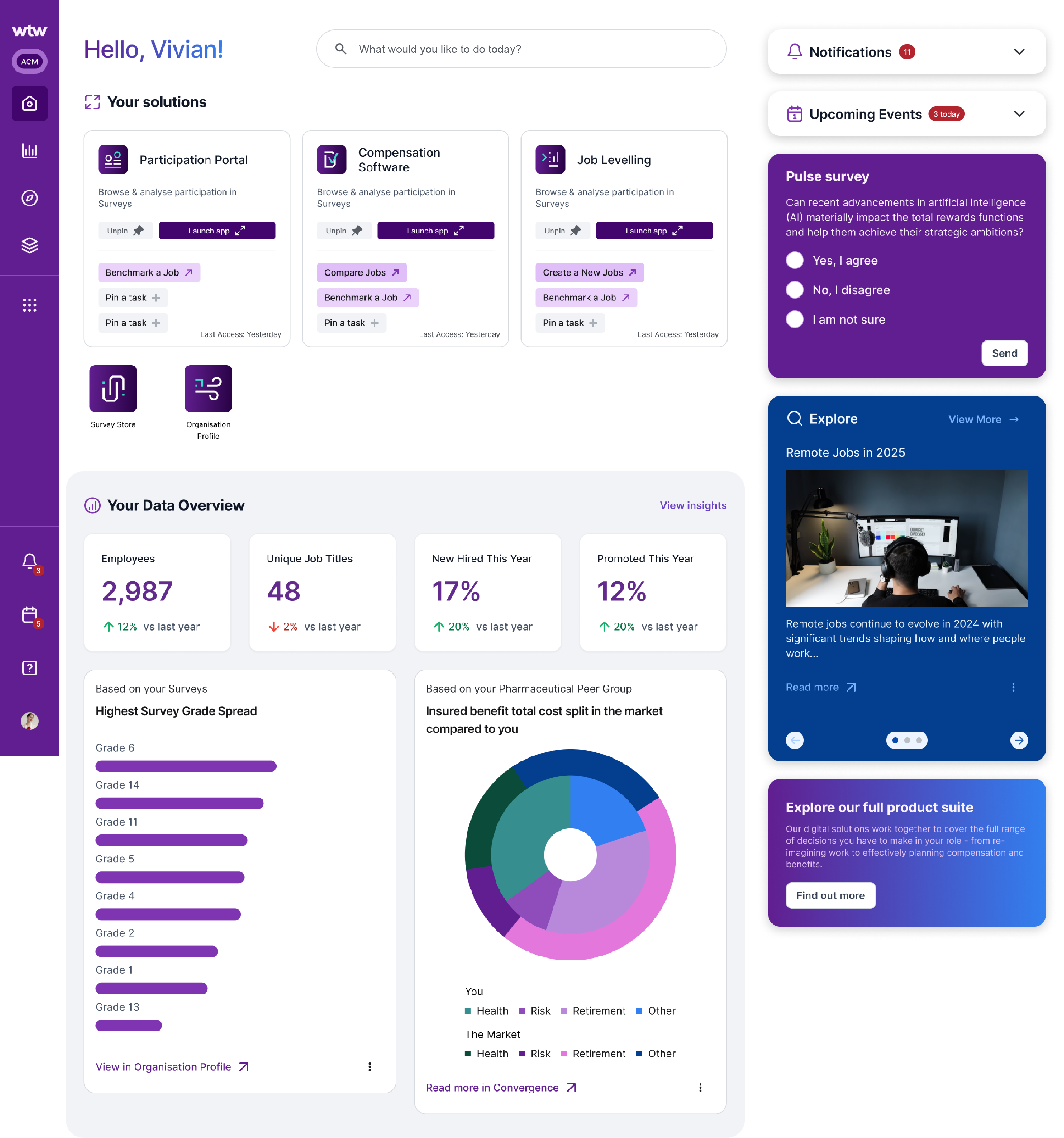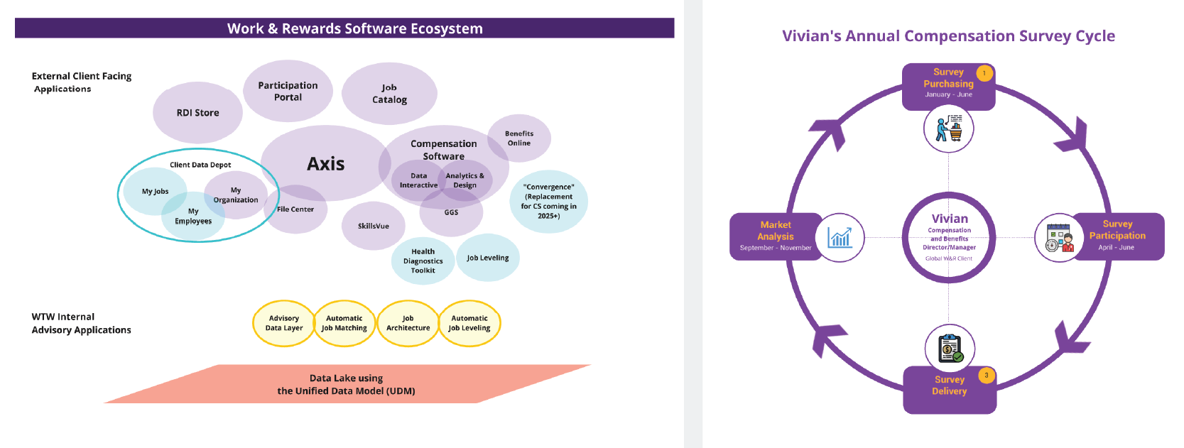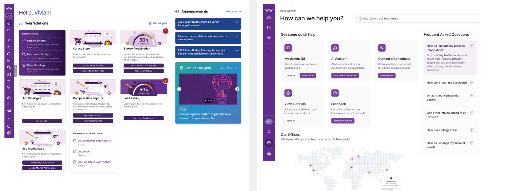 Willis Towers Watson’s Work & Reward ecosystem included multiple independently developed applications used by enterprise clients to manage compensation and workforce insights. The project aimed to create a unified homepage that simplified access and established a foundation for a connected product experience.